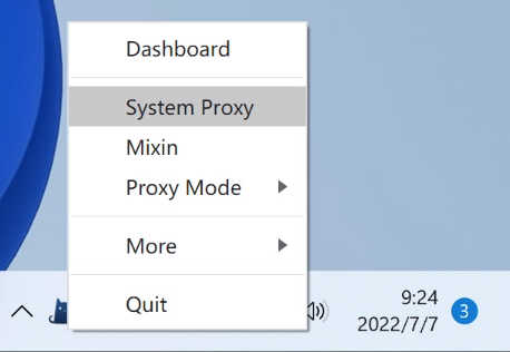 6. 回到右下角，找到Clash，点击右键，选择【System Proxy】。