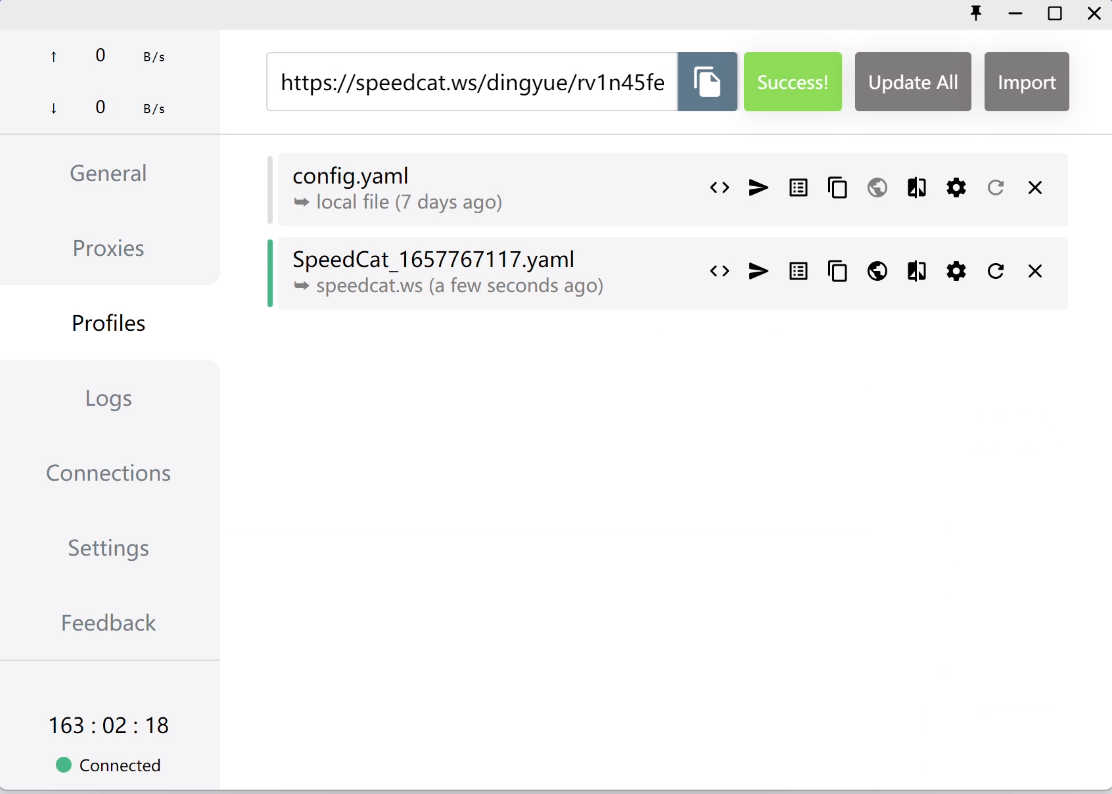 <figure><img src="https://2527689946-files.gitbook.io/~/files/v0/b/gitbook-x-prod.appspot.com/o/spaces%2FIJzv6HLN9uCtR7X3jAT6%2Fuploads%2FOSPCGrn7nN9WMuZ0es2E%2F006-clash.jpg?alt=media&#x26;token=c77755c2-83b4-4521-9335-ae63a5a2820a" alt=""><figcaption><p>一键导入Clash/ClashX配置</p></figcaption></figure>